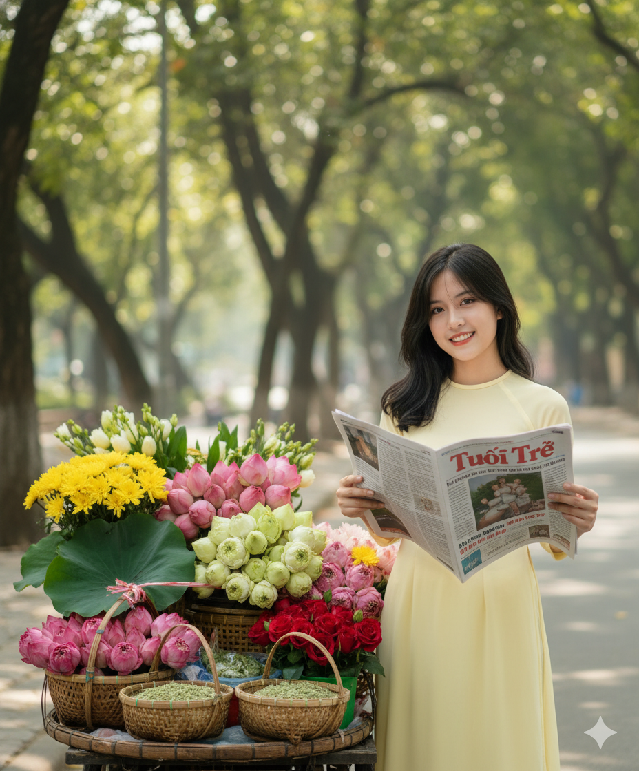 Prompt 1: Cô mặc áo dài màu vàng nhạt, tóc đen dài buông tự nhiên, tay cầm tờ báo Tuổi Trẻ, ánh mắt dịu dàng và nụ cười nhẹ. Xung quanh cô là gánh hàng xôi cốm, hoa sen và giỏ hoa nhiều sắc màu như hồng, đỏ, vàng, cùng lá sen xanh mướt. Phông nền là không gian ngoài trời sáng nhẹ, ánh nắng xuyên qua kẽ lá, mang lại cảm giác yên bình và thơ mộng. Toàn cảnh gợi nhớ Hà Nội những ngày thu, mộc mạc, trong trẻo và chan hòa hương cốm mới. Giữ nguyên khuôn mặt, màu da, thần thái như ảnh gốc.